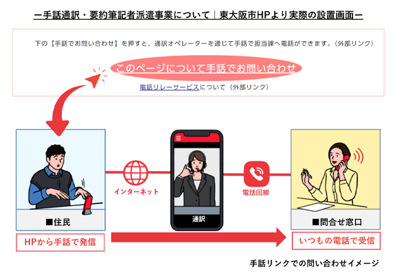日本財団電話リレーサービスから手話リンクを紹介された時、小山氏は「コスト面など導入のハードルは高くない。市民サービスも充実すると直感的に感じた」と話す。そこで、まず障害施策推進課が担当する手話通訳・要約筆記者派遣事業の窓口に導入することにした。市HPの同事業のコーナーに「手話でお問い合わせ」と記した手話リンクの「入り口」を設置。同課の井上青空氏が「目立つようにした」と話すように字体も大きくして赤い楕円(だえん)で囲った。